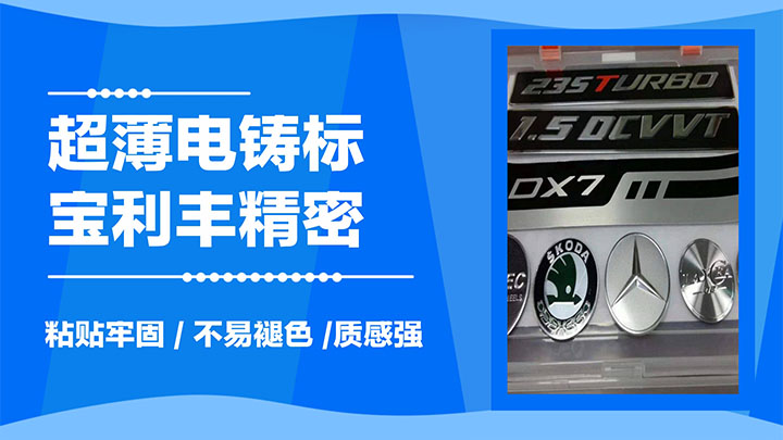 寶利豐生產(chǎn)的鎳標(biāo)客戶群體主要應(yīng)用于:數(shù)碼電子、工藝禮品、企業(yè)logo、汽車鑰匙、高爾夫球桿等等,定位中高端金屬商標(biāo)的制作生產(chǎn)與銷售。